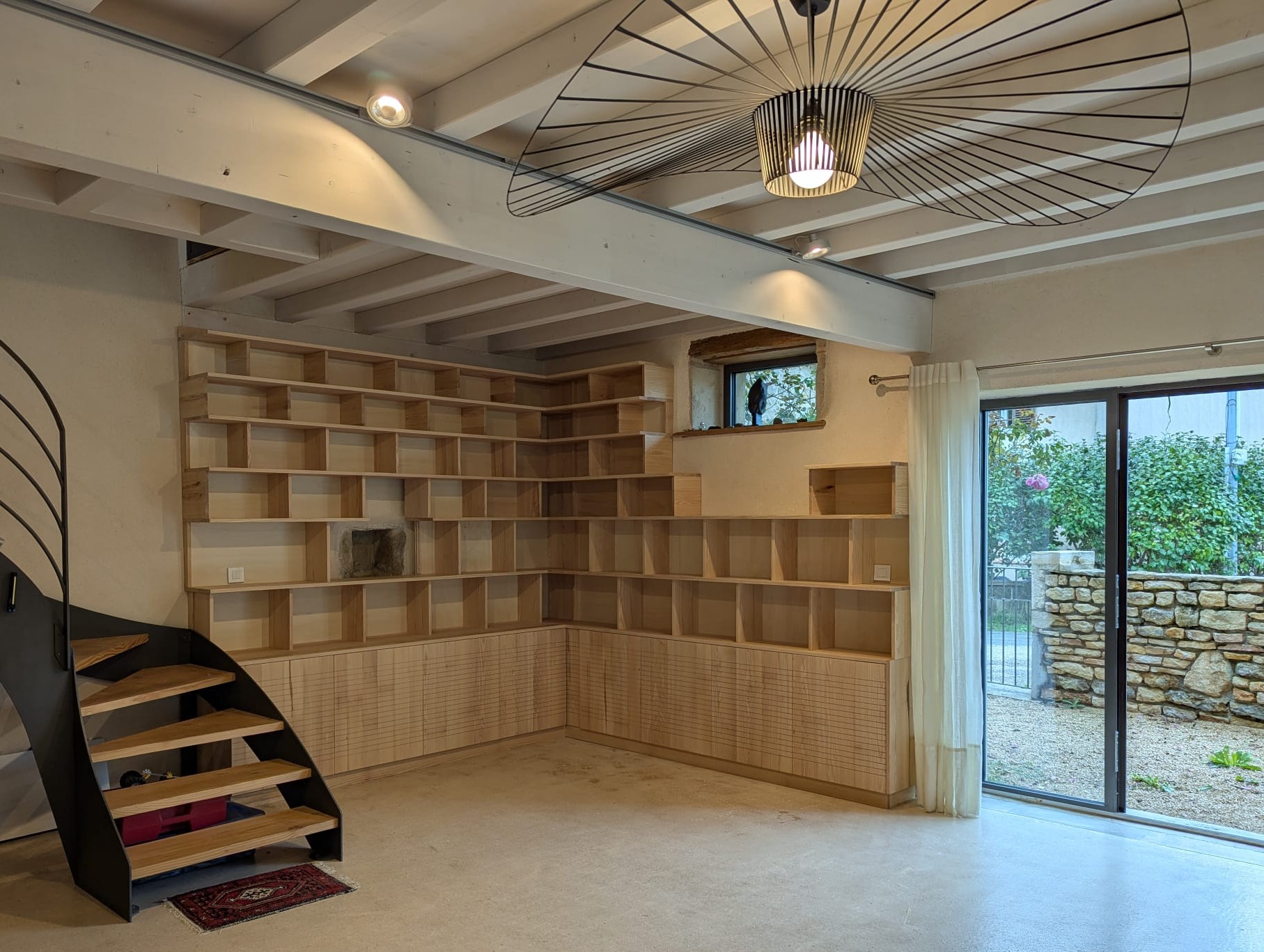 Je réalise des bibliothèques, des dressing, des tables, des tables basses, du mobilier de salon, des verrières… toujours sur mesure